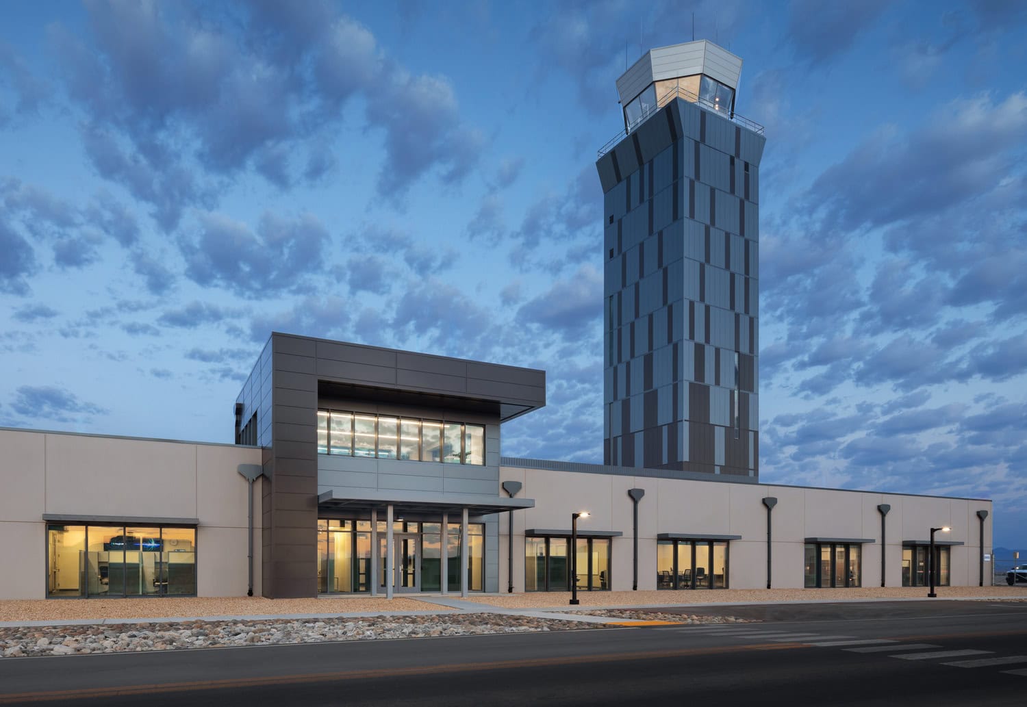 The Integrated Air Operations and Tower ($63.9M) is a 30,000 SF Aviation facility consisting of a 1-story Air Operations building and a 14-story, 150-foot-tall, Air Traffic Control Tower for oversight of the NAWS China Lake Armitage Airfield. The double-height main entry connects occupants to multiple air operations programs including flight planning, simulator, emergency command center, offices, conference rooms, classrooms, and the control lab.