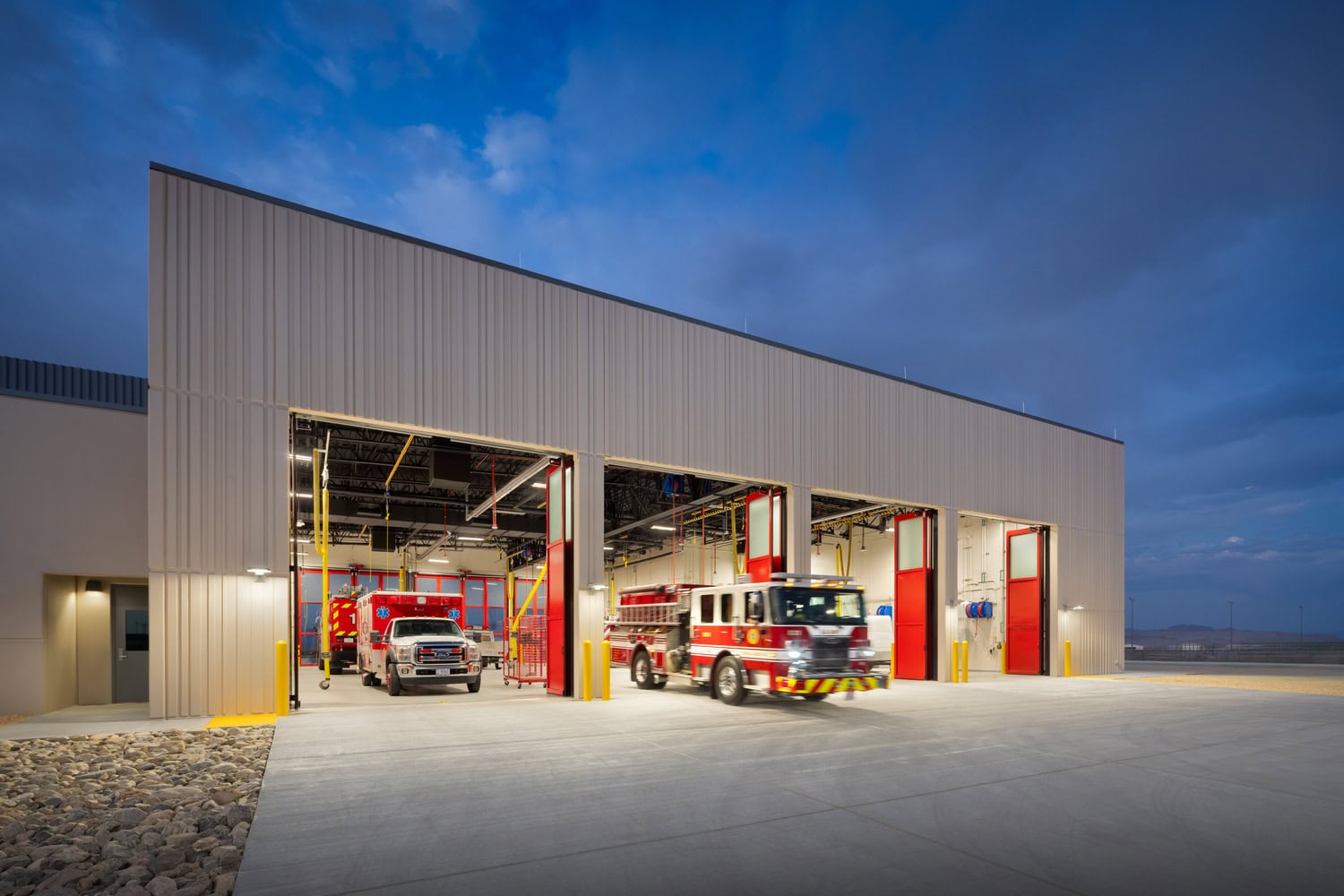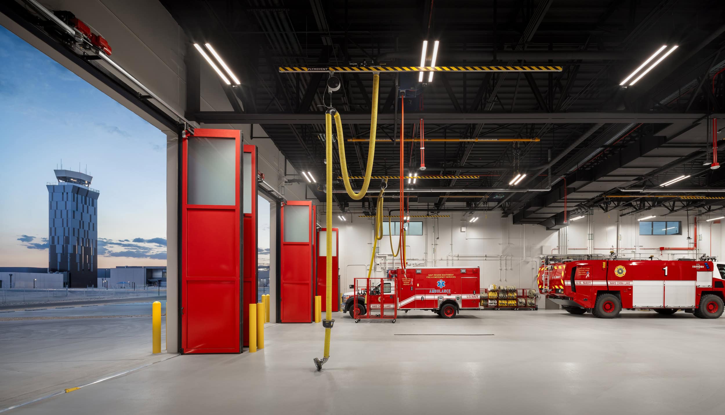 The Aircraft Fire & Rescue Facility ($38M) is a 20,799 SF Fire Station with an Apparatus Bay and Administrative Wing. The high-volume apparatus bay serves as a vehicle maintenance and warehouse facility for large emergency operation fire trucks. The administrative wing’s program consists of dorms, offices, training areas, physical therapy rooms, gym, meeting rooms, a commercial kitchen, and a dining facility.